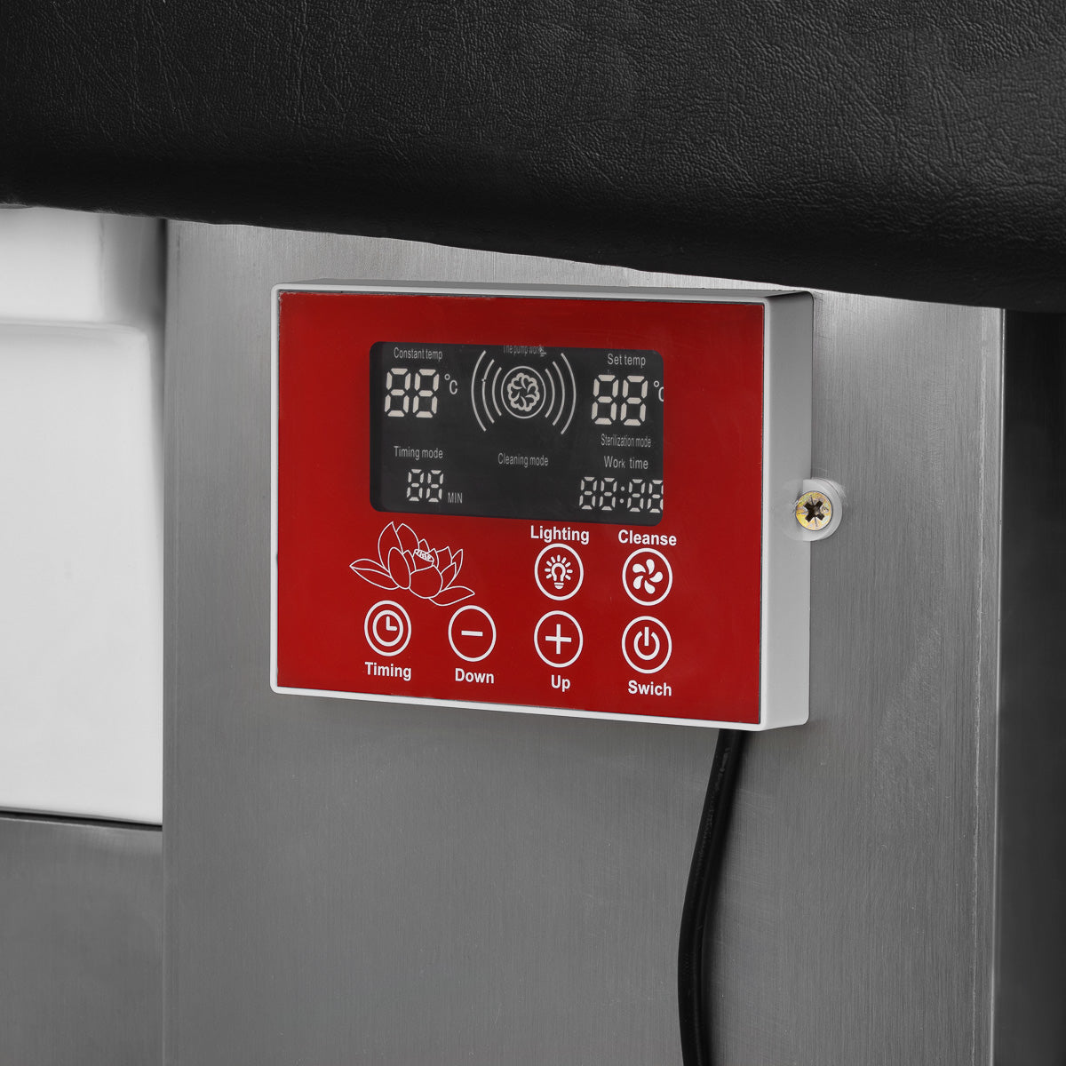 L'intuitivo pannello touch offre il pieno controllo delle funzioni dell'unità di lavaggio. Consente di regolare il tempo di funzionamento e la temperatura dell'acqua, nonché di monitorarne i valori correnti. Grazie al display integrato, è possibile verificare in qualsiasi momento il tempo di funzionamento del dispositivo. Il pannello consente inoltre di attivare la funzione di fototerapia, ovvero l'illuminazione della vasca, creando un'atmosfera di relax e benessere. Inoltre, il dispositivo per la terapia del vapore è dotato di un telecomando, che consente un comodo utilizzo a distanza.